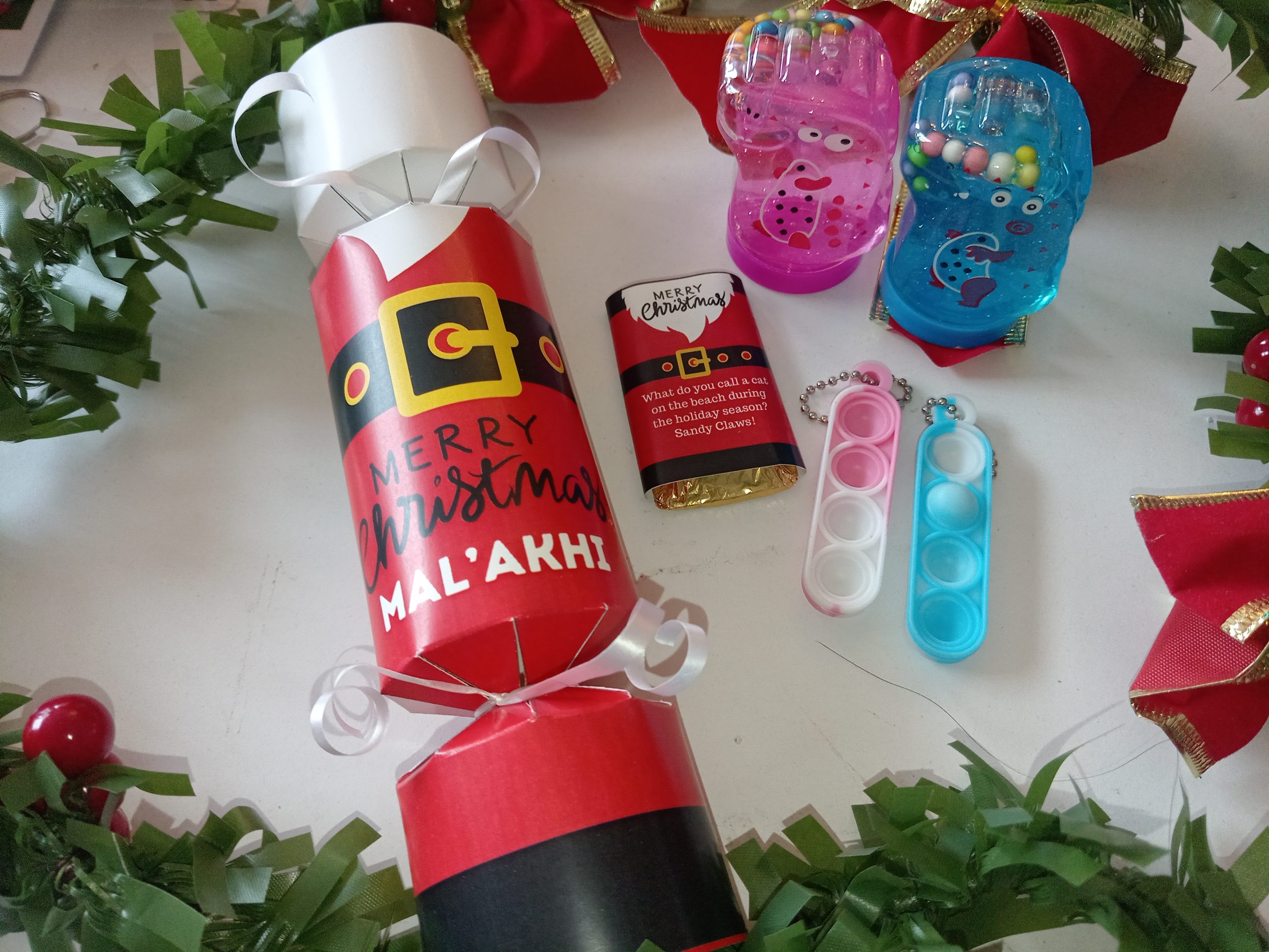 Personalised christmas cracker with snap Includes a milk chocolate printed with joke, slime or santa keyring